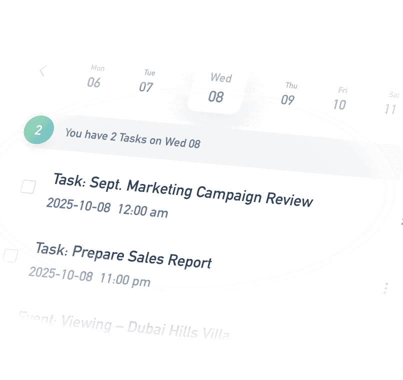 View every task, follow-up, or scheduled viewing right from the dashboard. Agents can organize their day, while managers monitor activity at a glance.