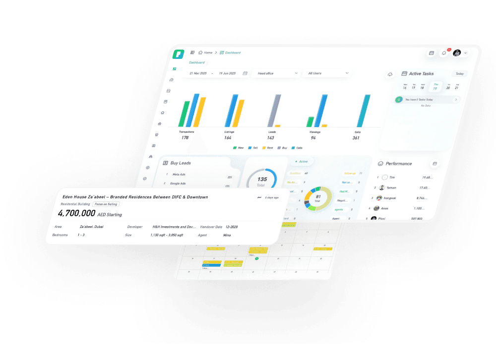 Agents handle high volumes of leads from platforms like Property Finder and Bayut, while managing listings, viewings, negotiations, and transactions simultaneously.